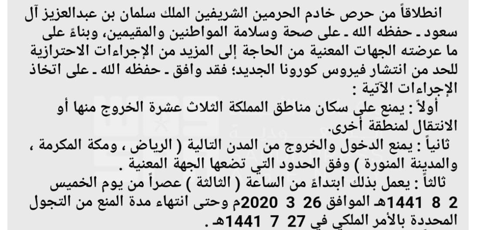 أهم قرار شكل ملامح الفترة الماضية من وجهة نظري (تعليق العمرة مؤقتاً للمواطنين والمقيمين) في 4 مارس، قرار شجاع وفي وقت مبكر جداً ساهم في إيقاف إنتشار محتمل للفيروس سواءً بالسفر أوالمخالطة، وإلا ربما سيشكل عشرات ومئات المعتمرين المصابين نقطة إنطلاق وتوزيع للفيروس لأماكن أخرى!