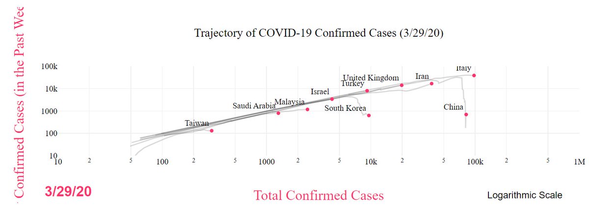 دول شرق آسيا سيطرت على الأزمة بحلول تقنية وإجتماعية تايون مثال إستثنائي (أسبوع 11 تسجيل 298 حالة)، كوريا الجنوبية حلول تقنية وإجتماعية (أسبوع 11 تسجيل 9583 حالة) ماليزيا (أسبوع 10 تسجيل 2470 حالة)، بالمقابل إيران في الأسبوع السابع تجاوزت 38 ألف وتركيا في الأسبوع الرابع وسجلت 9217