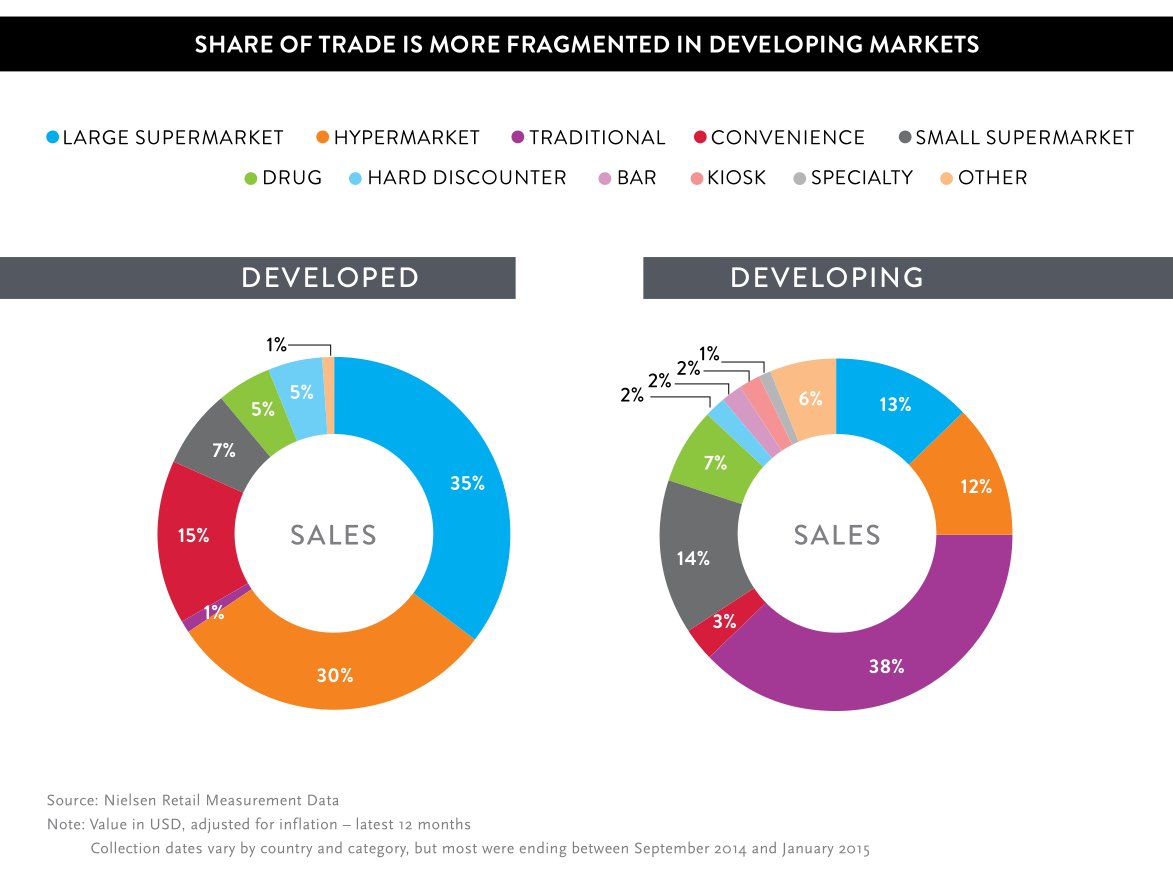 في الأسواق المتقدمة، تتركز المبيعات في محلات الهايبر/السوبر ماركت في التالي: