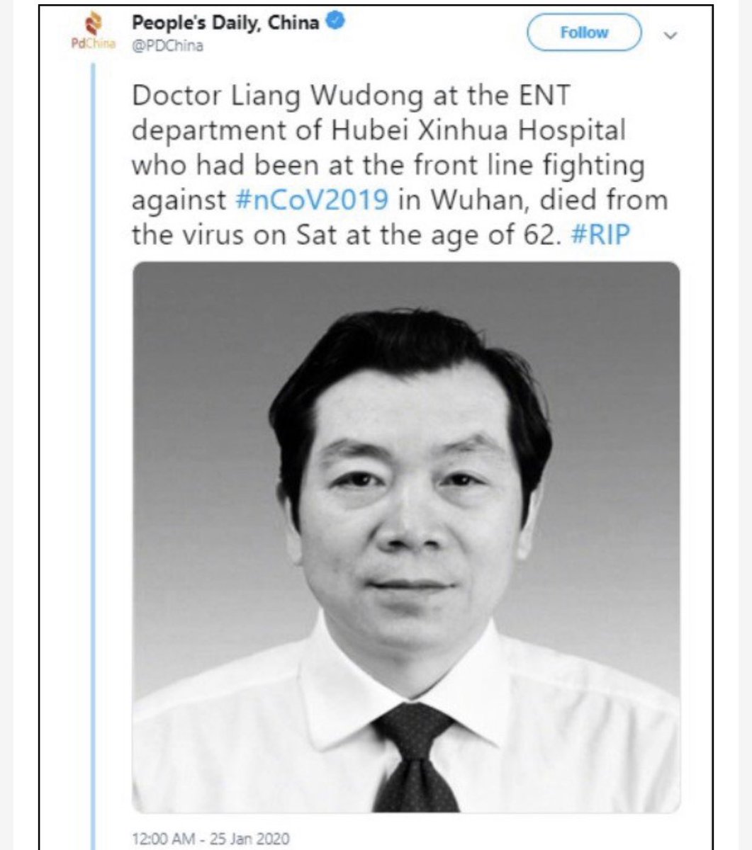 الصين: مدينة ووهان بؤرة المرض كانت هناك تقارير أولية تحذر أن أخصائيين أنف واذن وحنجرة اصيبوا بأعداد كبيرة ب #فايروس_كورونا والتي أدت إلى وفاة العديد من الاطباء بظروف غامضة