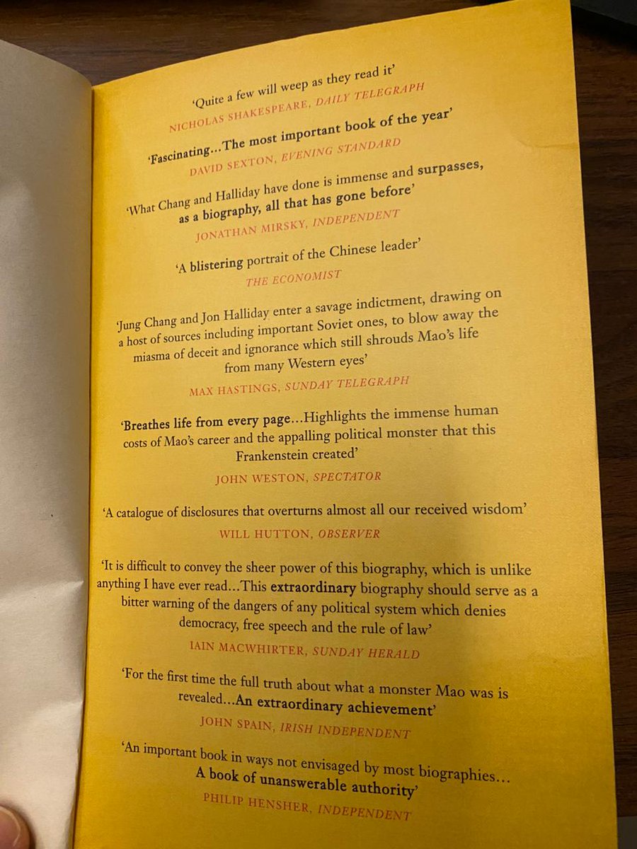 إلا أن القارئ الفطن لا يكاد يجد جملة تخلو من وصف مبطن لماو بالدكتاتورية والجبروت والقتل والجريمة. بل يندر أن تجد اشارة الى ميزة للرجل في ادارة الازمات التي مر بها تكوين الدولة الصينية الحديثة التي تنافس القطب الآخر في السيطرة على العالم صناعيا واقتصاديا كما نرى هذه الأيام.