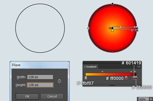 ركز على الصورة الثالثة، وحدد أكبر شكل بيضاوي للضوء الذي تم إنشاؤه حديثًا وقم بعمل نسخة منه وأحضر النسخة إلى المقدمة (Right Square Bracket+Ctrl+Shift). ثم استبدل لون التعبئة الحالي لهذا الشكل بتدرج دائري جديد كما هو موضح في الصورة الأخيرة