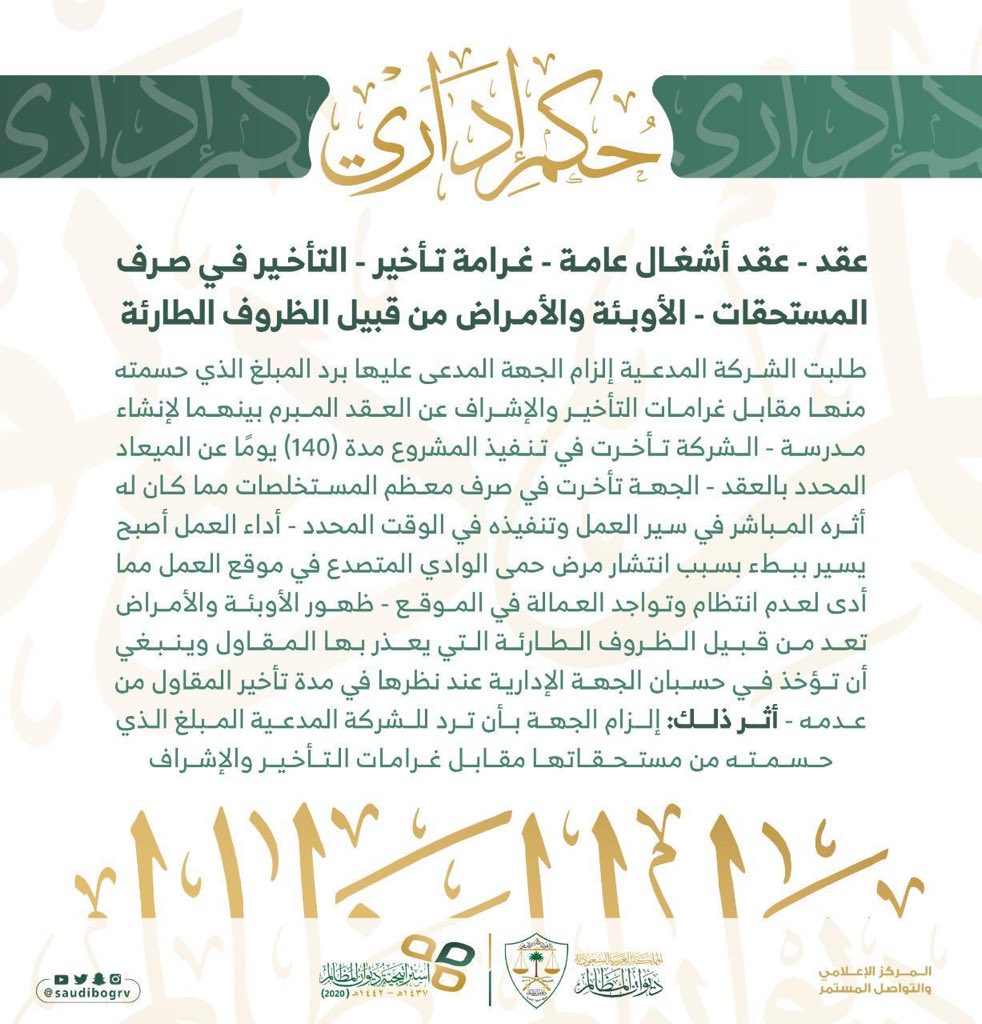 للمهتمين بـ #عقود_المقاولات ديوان المظالم مشكورًا ينشر مجموعة من السوابق القضائية التي تثبت عدم أحقية الخصم على المقاول اثناء الظروف الطارئة.