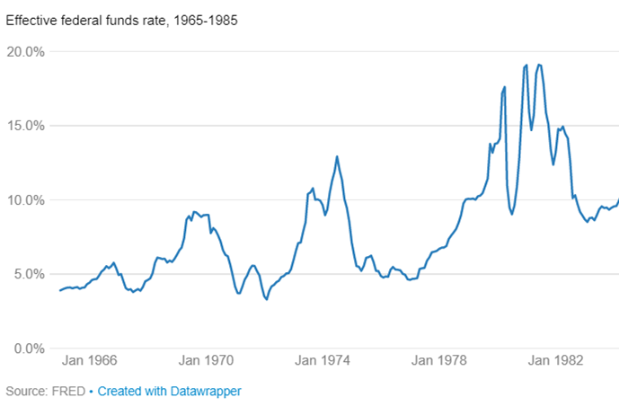 9. هذا الرفع السريع والقاسي أدخل الإقتصاد الأمريكي في حالة ركود في بداية الثمانينات ولكنه قضى على التضخم الذي انخفض إلى 2% بحلول 1982. وبعدها دخلت أمريكا في مرحلة "الإعتدال العظيم" والذي امتد إلى نهاية التسعينات.