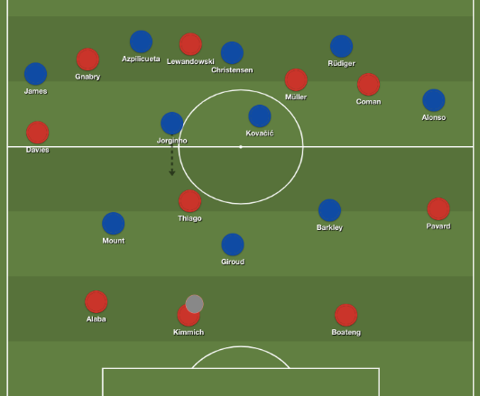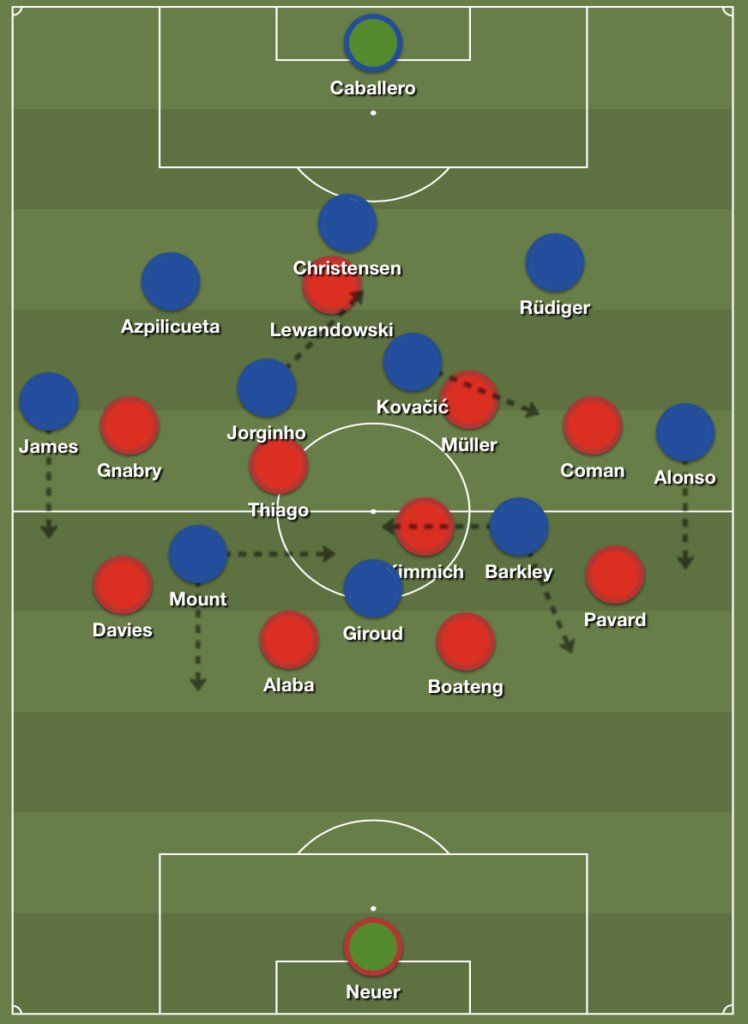 لاعبوا تشيلسي لا يعرفون فك الكرات من لاعبي بايرن بسبب الانتشار المثالي للفريق وتشكيل ثلاثيات في كل أرجاء الملعب وفي كل مرة يصل بايرن للثلث الأخير يكون توماس مولر بلا رقابة لذلك هو كان كلمة السر في تلك الامسية وهذا ما قاله المدرب شخصيا بعد المباراة .