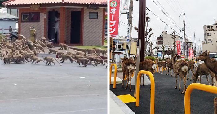 الصور المرفقة من مناطق مختلفة في العالم، حيث أن الحيوانات لم تكن بهذا القرب من المُدن السكانية مِن قبل !، الحرية ثمينة لهذه الأمم التي هي أمثالنا و لكننا بغرورنا إستحللنا دماءها مثلما تدافعنا بالمناكب لنظلم بعضاً بعضا و صدق العظيم جلّ و علا حين قال أن الانسان لظلوم كفّار ?.