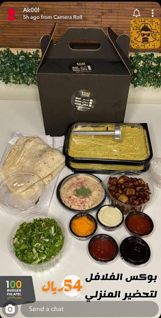 تحتوي على عجينة الفلافل مع الملعقه الخاصه في تكويرها + حمص + باذنجان مع سلطه وصوصات مع خبز الصاج بسعر ٥٤ريال