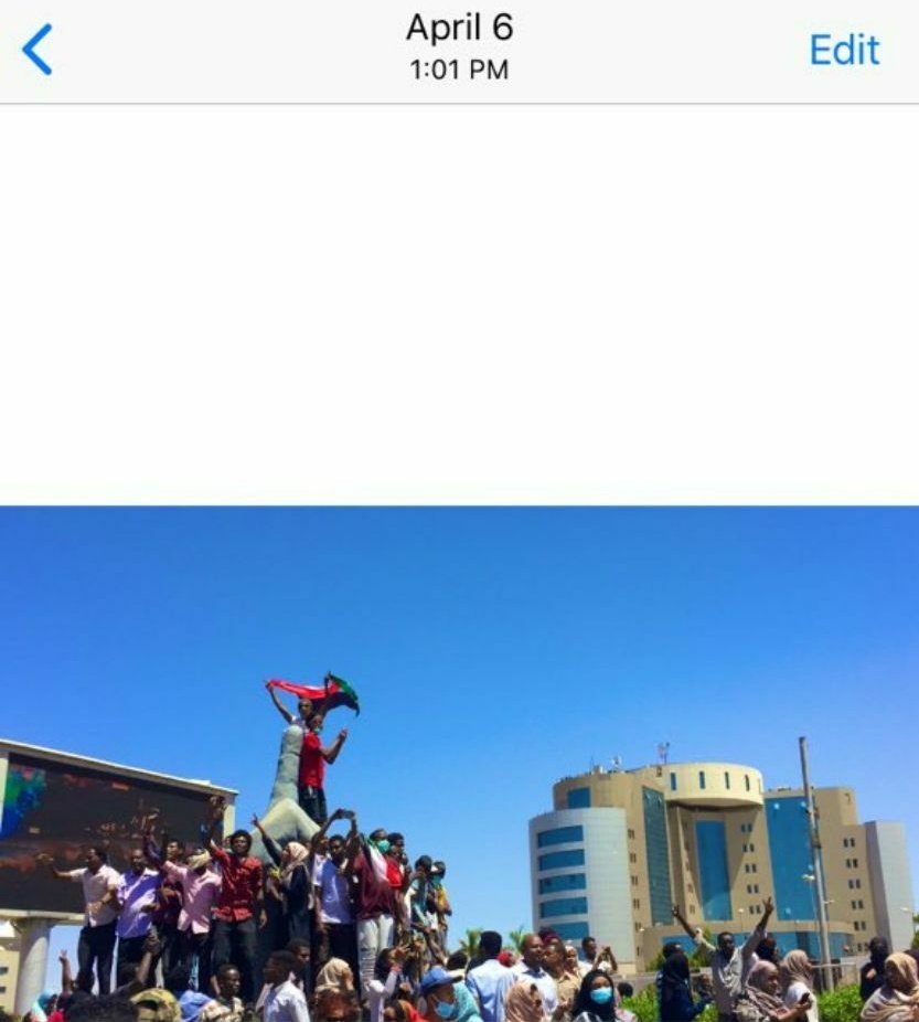 وصلنا البيت زي ٦:١١ كدا وامي فاجئتنا بي انو الاعتصام ما اتفض قدر ما شرحت ليها انو لا اتفض انا هسا جاي من هناك ورصاص وموت وبتاع يا عمر الاعتصام ما اتفض غايتو صدقت على مضص ومشيت ارقد لانو حرفيا ما كان فنيي حيل لاي شي تاني ودي كانت نهايه ٦ ابريل بالنسبه لي
