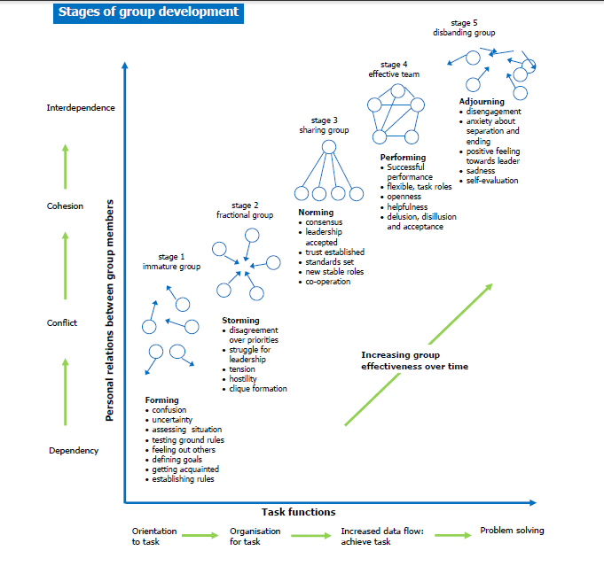2-المرحلة الاولى، مرحلة التشكيل او التجميع: في هذه المرحلة يبدأ الفريق بالتعارف على بعضهم و تحديد الأهداف والقوانين اللازمة التي تحمكم المجموعة. يكون طابع هذه المرحلة الغموض والحيرة و التشويش. عادة تكون فترة قصيرة جدا.