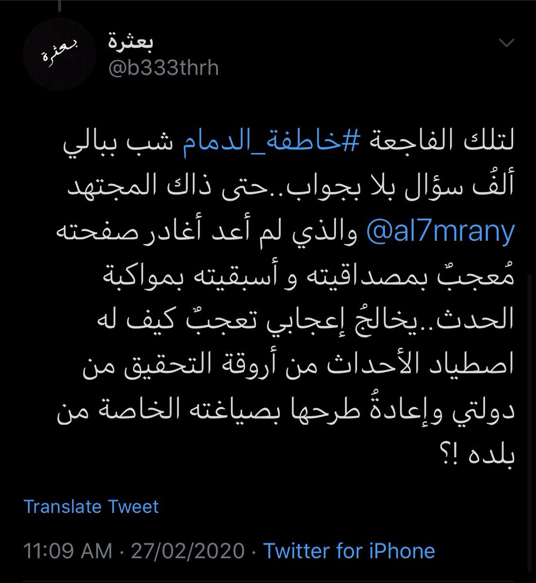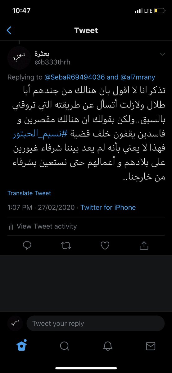 كان بوسعي حظره بكل بساطة ولكن ما دعاني للاهتمام في كشف كذبه هو كمية المتابعين له من ابناء وبنات الوطن المغرر بهم ممن استغل عاطفتهم حتى جعلوا منه رمزًا وبطلاً واقفين بوجه كل من يحاول تنبيههم من شره وقد قلت جميع ذلك بحسابي هذا و حسابي @b333thrh