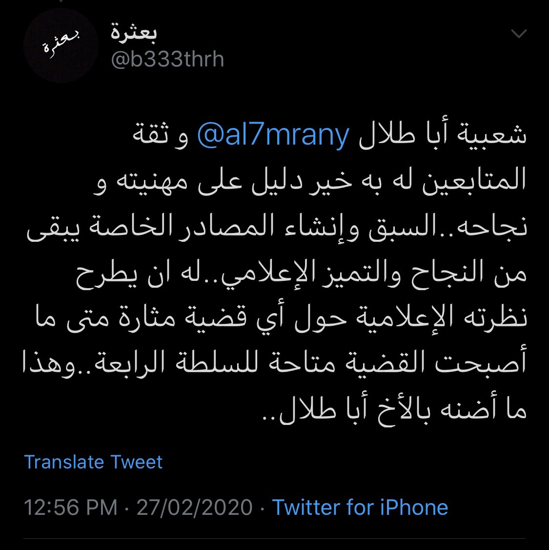 أود أولا عن أأكد على نقطة سبق وأن قلتها #أبو_طلال_الحمراني هو من أعادني إلى تويتر وجذبني بطريقة طرحه وتناوله لأحداث #خاطفة_الدمام حيث وجدت فيه فيه الإعلامي الناجح بمواكبة الحدث والمصداقية حتى بدأ يتضح لي منه أسلوب لا أجد كلمة ألطف من أسلوب قذر كما قلت سابقاً