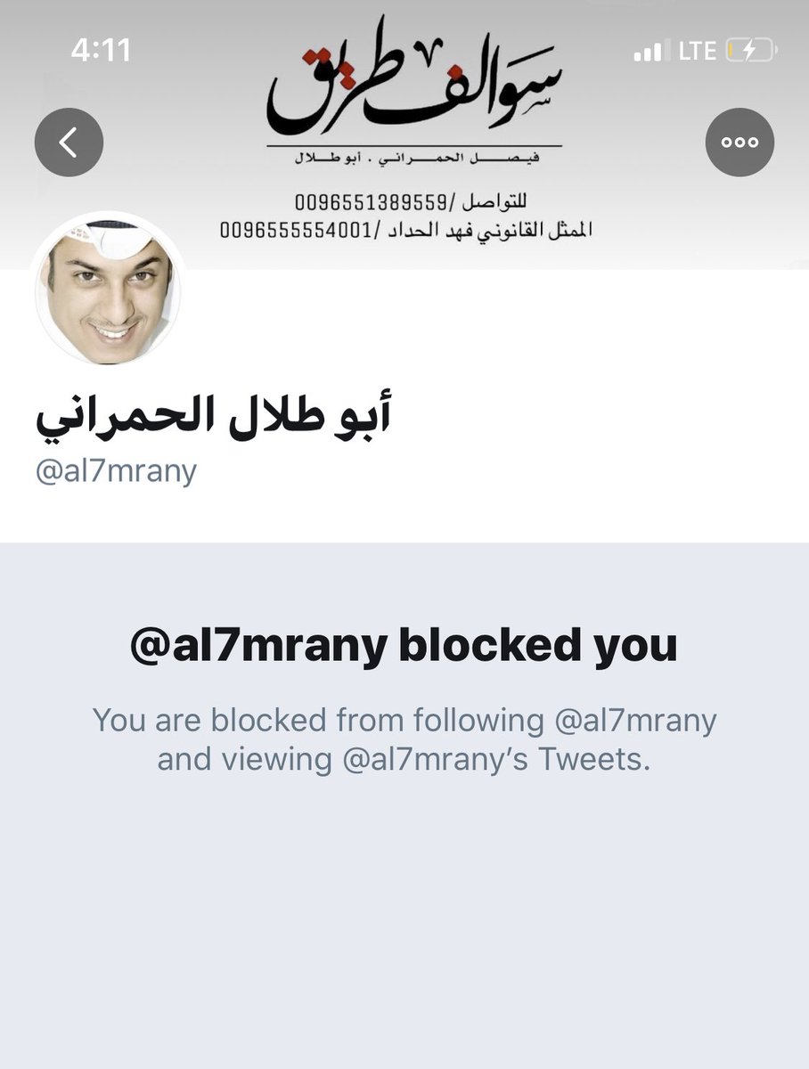 متابعي #أبو_طلال_الحمراني سؤال لكم حسابي غير معروف ولست بصاحب رأي عام قد أشكل خطرا على نجاحه المزعوم وان كان كما تقولون لا يسعى للشهرة على انقاض قضية إنسانية فلماذا انتبه لحسابي الضعيف وقام بحظره؟هو أسلوب ضعيف الحجة كجماعة تأثرنا منها لأعوام (يقال بانه تابع لها) #ابو_طلال_زودها