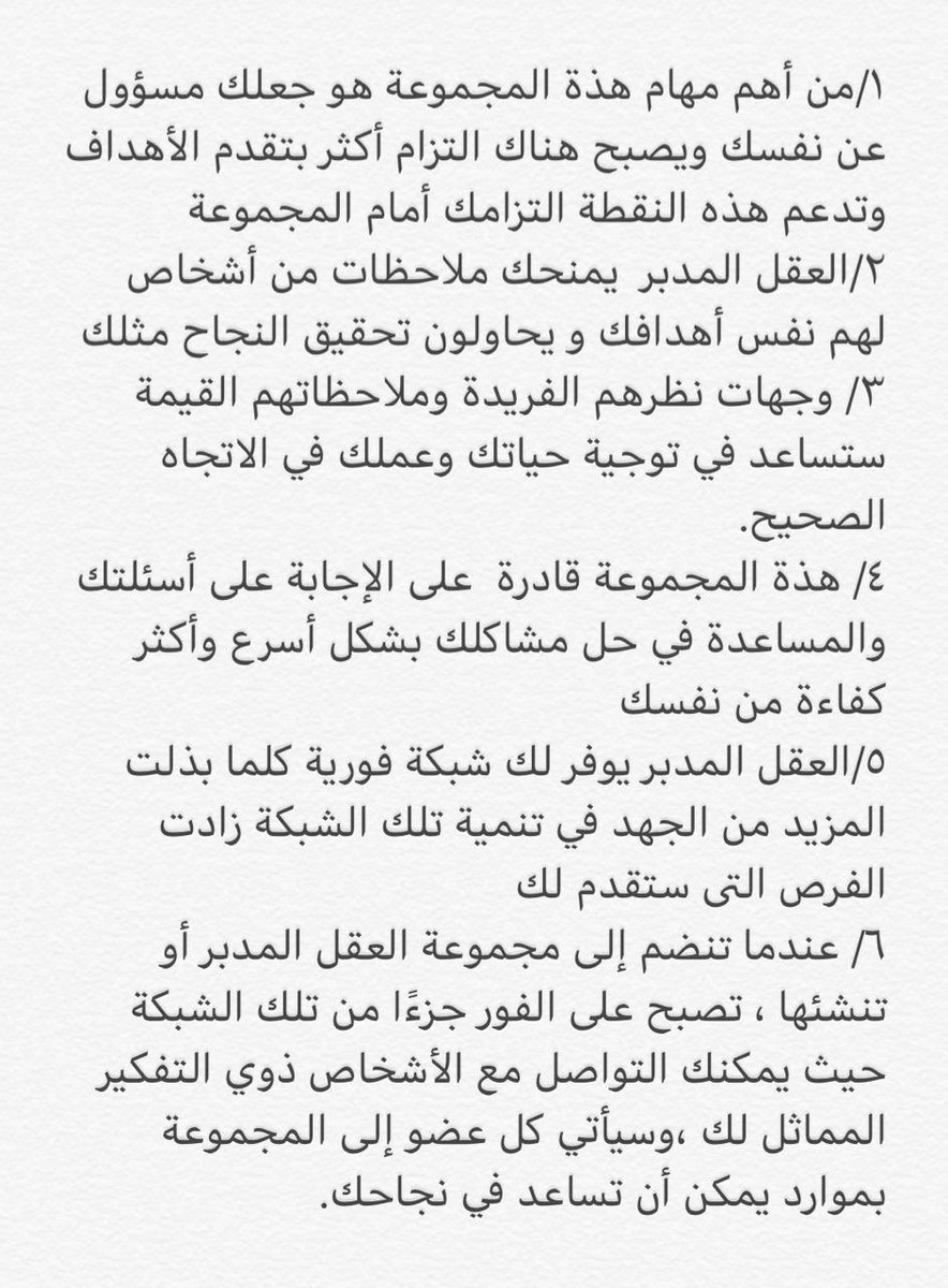 إذاكنت ترغب في تحقيق المزيد من النجاح في حياتك فعليك أن تفعل الشيء نفسه يجب أن تحيط نفسك بأشخاص يلهمونك ، ويرفعونك عندما تسقط، ويتحدوك لتصبح أفضل ، ويؤمن بقدرتك على تحقيق #أحلامك،أفضل طريقة لإنشاء هذه البيئة التمكينية هي من خلال إنشاء أوالانضمام إلى "مجموعةالعقل المدير"