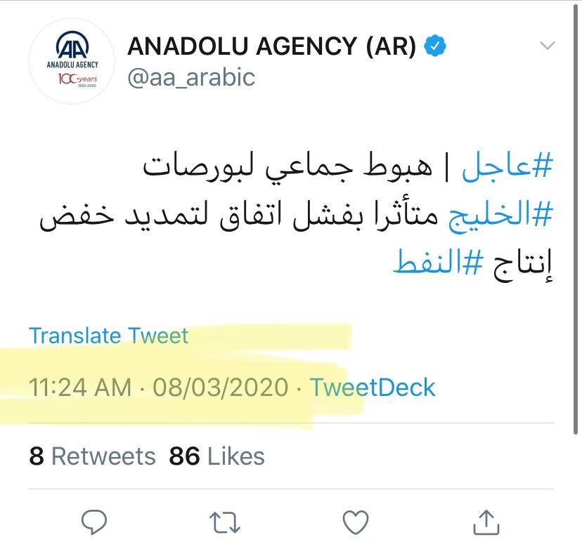 هنا مثالاً تغريدين عن هبوط أسواق الأسهم في السعودية والخليج وبينها 21 دقيقة فقط: