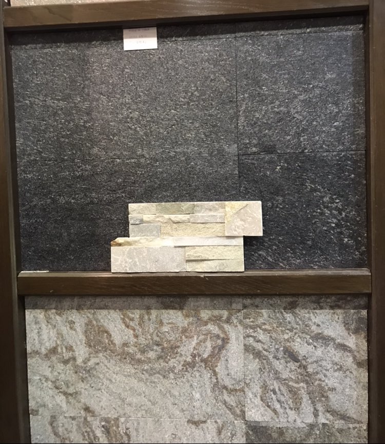 وبحسب التصميم تم اعتماد الحجر الصيني الرصاصي المقاس العشوائي على الجدار