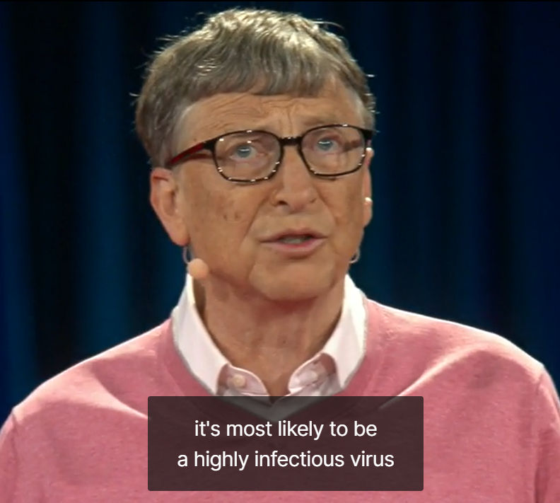 يُذكر أن بيل غيتس في عام 2015، خلال إحدى محاضرات مؤتمر "تيد" (Ted Talk) بعنوان "التفشي القادم.. متى؟" قد حذر العالم من أن العالم ليس على استعداد لمواجهة جائحة عالمية، ومن خلال المحاكاة أوضح أن العالم سيواجه وباء جديداً كل 20 عاماً، مؤكداً على أهمية التخطيط لهذا الشأن.