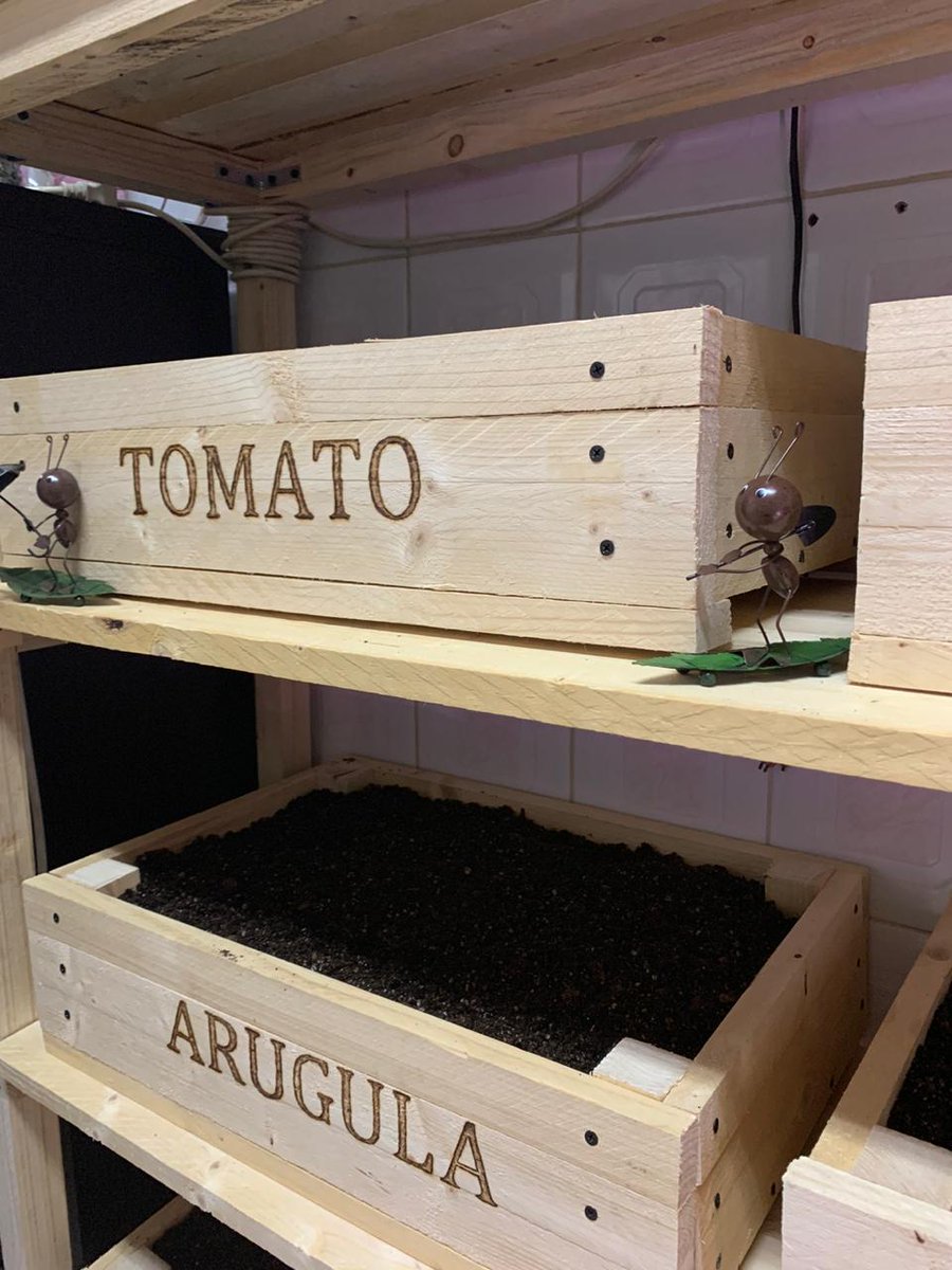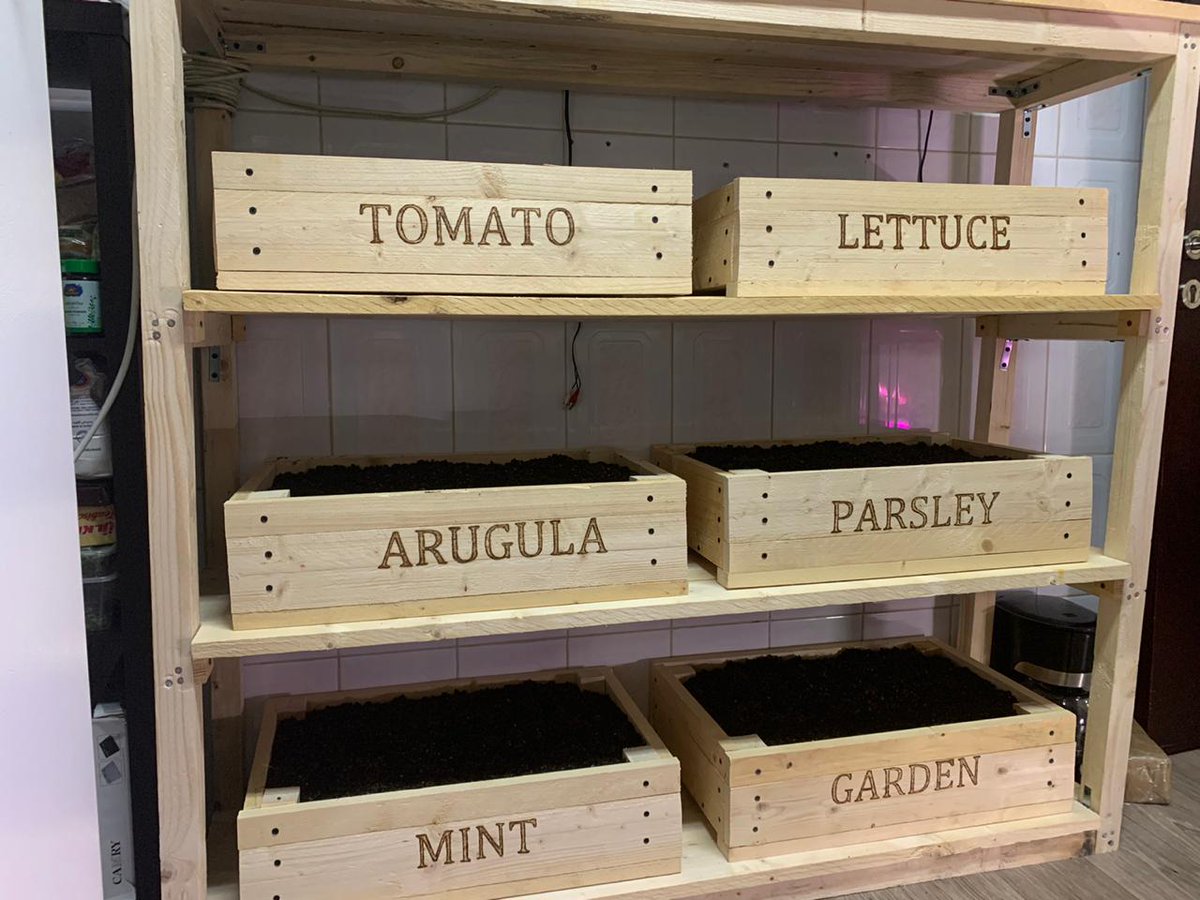 نموذج لاحواض التشتيل عملتها إحدى الأخوات بنفسها عبارة عن احواض فيها تربة زراعية ووضع إنارة لكل حوض ووضعها داخل المطبخ.