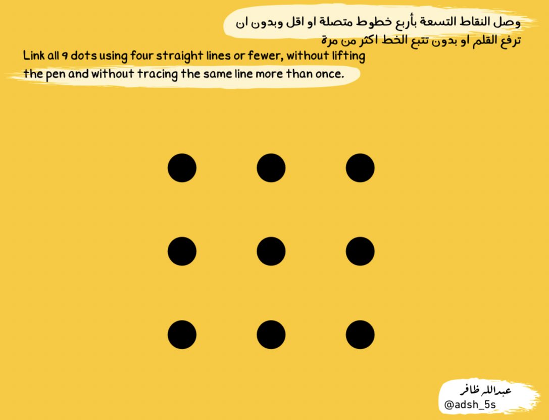والي يتحدى ان تصل النقاط التسعة باربع خطوط متصلة او اقل وبدون ان ترفع القلم او بدون تتبع الخط اكثر من مرة ..