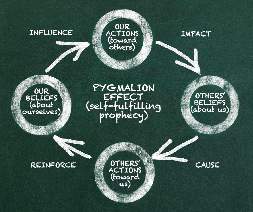 مثاله أن ترى في نفسك أنك كاتب بارع فتكتب الكثير فتصبح بارعا بالفعل رغم أنك لم تكن كذلك