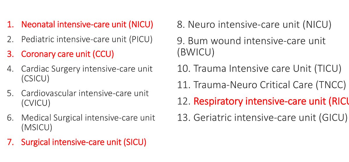 intensive care unit (ICU), critical care unit (CCU), intensive therapy unit, or intensive treatment unit (ITU): is a specialized department in a hospital that provides intensive-care medicine
