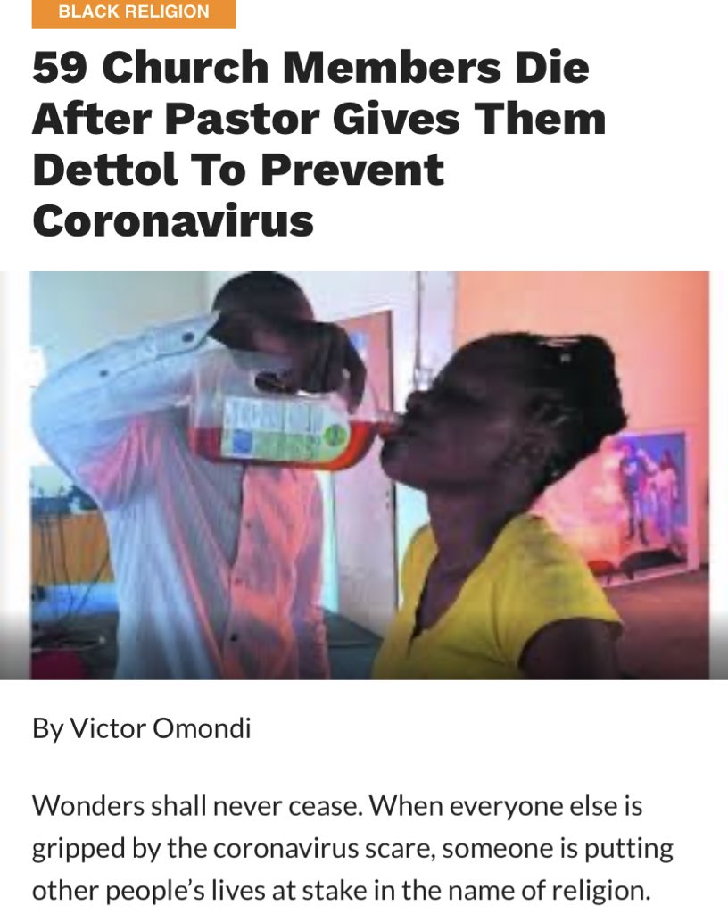 بين نفي وتأكيد ، تداولت الصحف في جنوب افريقيا حول مقتل ٥٩ شخص بعد اتباع توصية قسيس أحد الكنائس بشرب "ديتول" للوقاية من فيروس كورونا