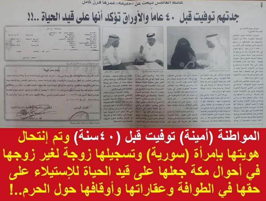 4- نشرت المدينة 2008م قضية انتحال وافدة هوية مواطنة سعودية بمكة قبل اكثر من 50سنة