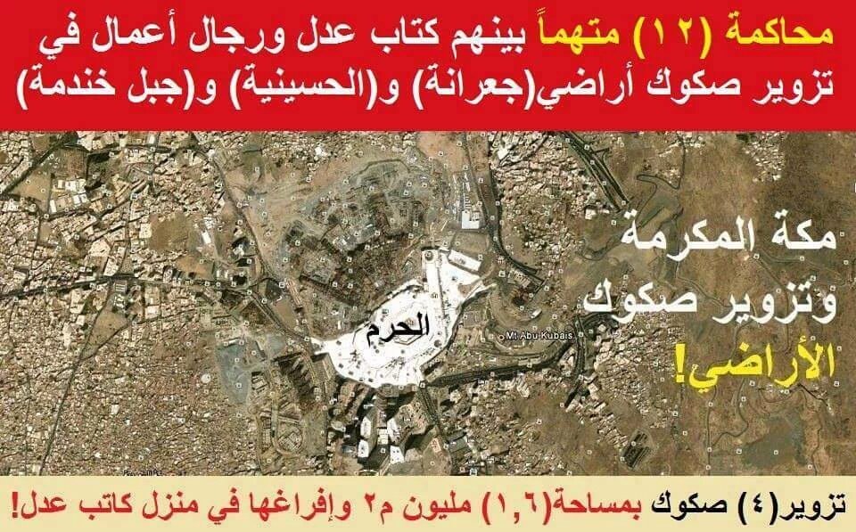 ومن بينها قضايا فساد الأراضي..ونشر عن تزوير صكوك اراضي مكة الذي وصل إلى صكوك استحكام زراعية على جبال حول الحرم بينها جبل خندمة وهي لم تزرع قط بالتاريخ؟!