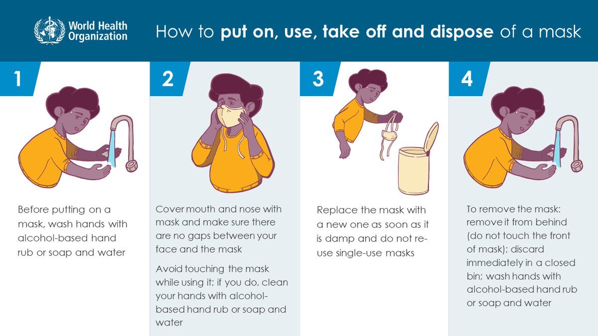 ارتدِالقناع فقط إذا كنت مريضًابأعراض COVID-19 (خاصة السعال)أورعاية شخص قد يكون لديه COVID-19 يمكن استخدام قناع الوجه مرة واحدة فقط إذالم تكن مريضًا أو تعتني بشخص مريض فأنت تهدر قناعًاهناك نقص في الأقنعة على مستوى العالم لذااستخدام الأقنعة بحكمة