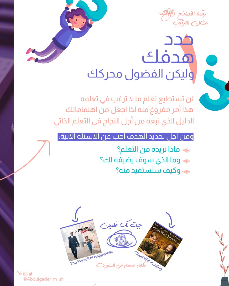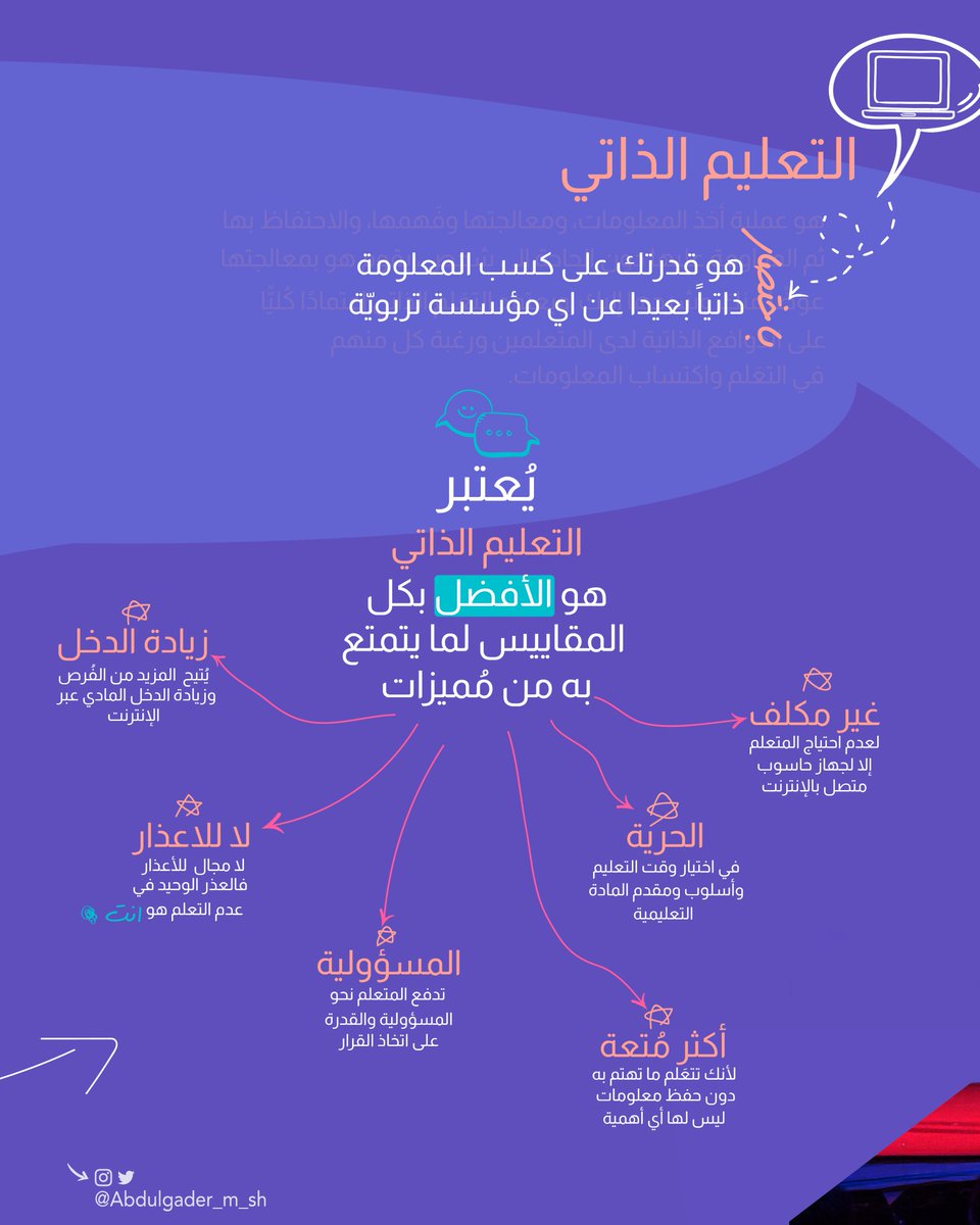 جبت لكم بعض النصائح عشان يكون التعليم الذاتي فعال وممتع وماينهدر فيه وقت ماله داعي مع عدم استفاده منه ,مع الاوضاع هذي الايام والحجر الصحي وغيره فضروري ماتلقا شخص الا وحسن من نفسه عن طريق التعليم الذاتي ...