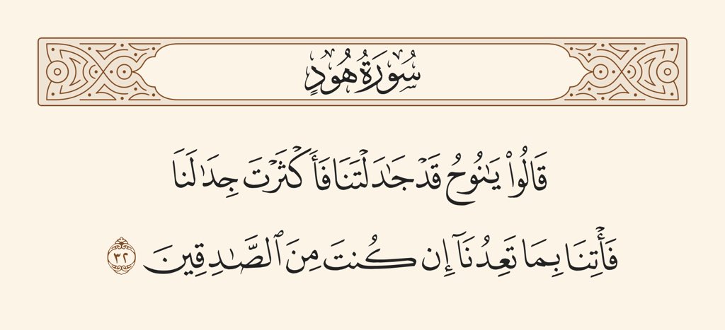﴿لَقَد أَرسَلنا نوحًا إِلى قَومِهِ فَقالَ يا قَومِ اعبُدُوا اللَّهَ ما لَكُم مِن إِلهٍ غَيرُهُ إِنّي أَخافُ عَلَيكُم عَذابَ يَومٍ عَظيمٍ﴾ [الأعراف: ٥٩]