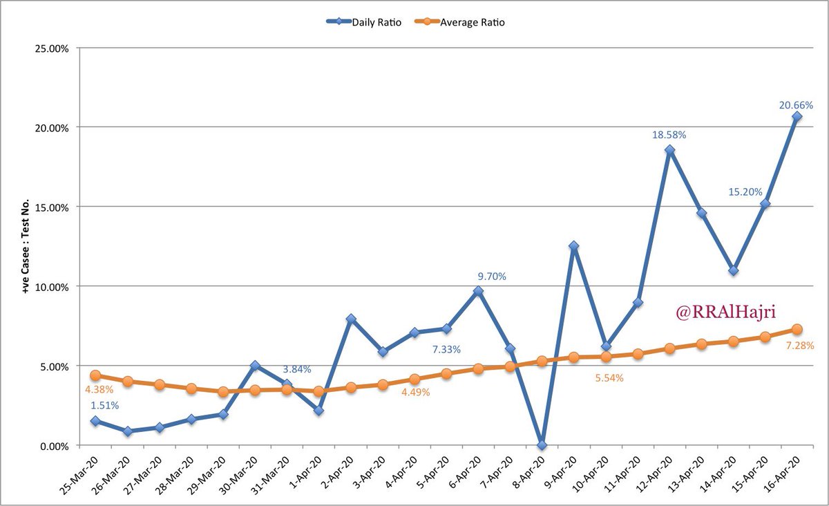 يوم ١٦ ابريل: ٣٩٢/١٨٩٧ = ٢٠.٦٦٪ ، بمعنى اخر ان من بين كل ١٠٠ اختبار صار اليوم كانت هناك ٢٠ حالة ايجابية