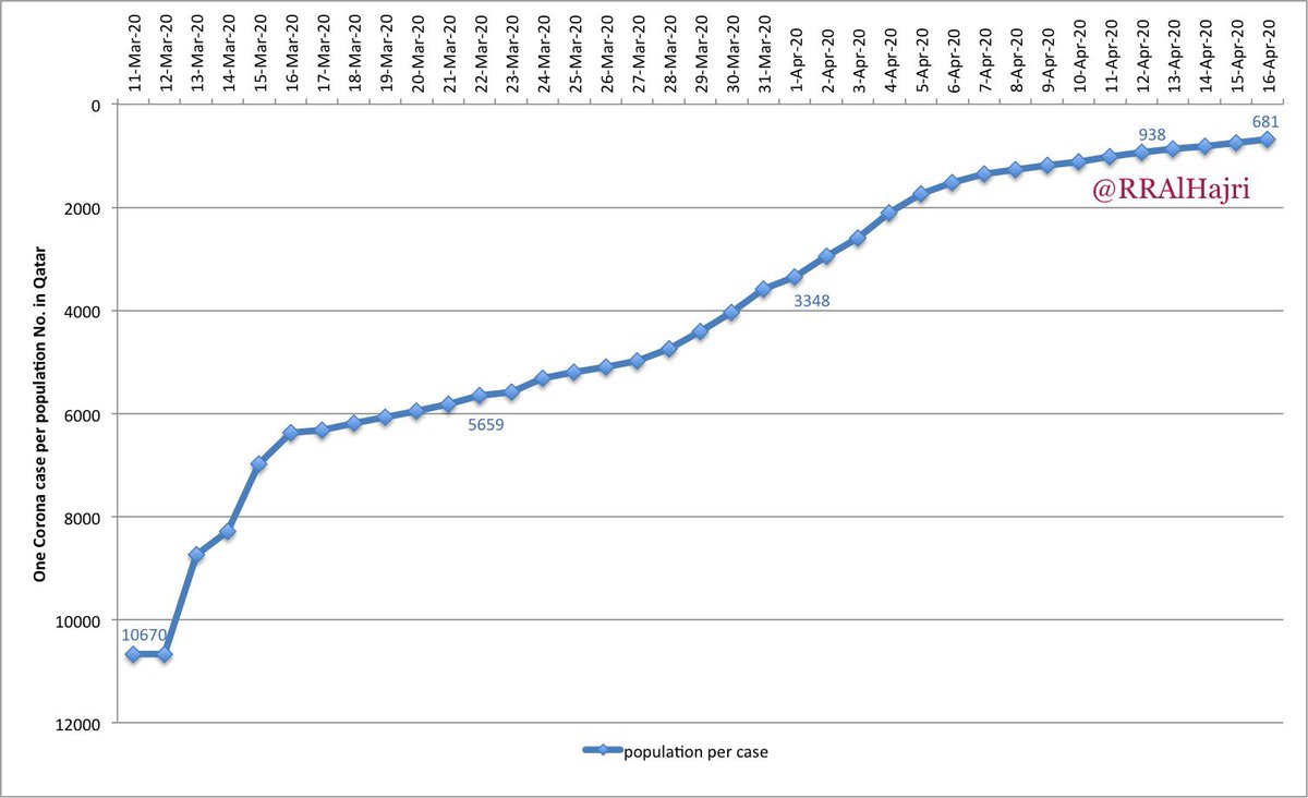 عدد الحالات الإيجابية حتى يومنا هذا هو ٤,١٠٣ حالة ، في المقابل وحسب بيانات جهاز التخطيط والإحصاء بلغ عدد السكان داخل دولة قطر في نهاية شهر مارس نحو ٢,٧٩٥,٤٨٤ نسمة ، مما يعني حالة كورونا لكل ٦٨١ فرد #لأجل_قطر_كلنا_في_البيت #خلك_في_البيت