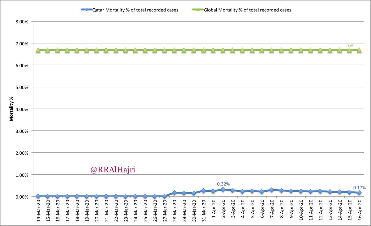 الجدير بالذكر ان منظمة الصحة العالمية @WHO أعلنت مطلع الشهر الماضي (مارس ٢٠٢٠) ان نسبة الوفيات من اجمالي المصابين تقدر ب٣.٤٪ ، نحمد الله ان النسبة عندنا اقل بقليل ٠.١٧٪ مقارنة ب٣.٤٪ حسب المنظمة و٧٪ حسب متوسط وفيات كورونا حول العالم. الحمدلله #لأجل_قطر_كلنا_في_البيت #خلك_في_البيت