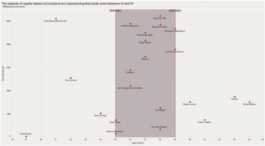 كما هو موضح أدناه فإن معظم اللاعبين الذين جمعوا معظم الدقائق لليفربول في الدوري الإنجليزي الممتاز هذا الموسم تتراوح أعمارهم بين 25 و 29 عامًا.