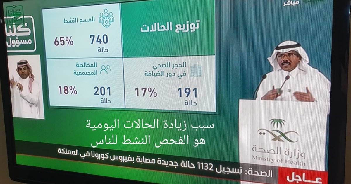 من ضمن ما تم التصريح به اليوم: حالات الشفاء في مكة وصلت الى ٣٤٣ بينما الإصابات الجديدة ٣١٥ و اغلبهم من المسح الميداني النشط.