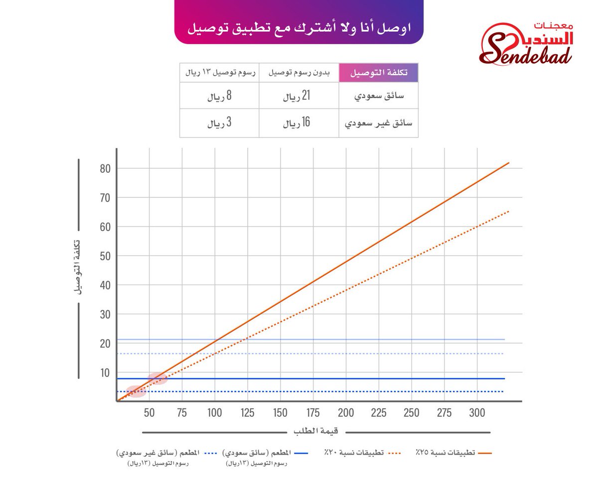 انت يا صاحب المطعم يكلفك الطلب 21 ريال اذا قمت بتوصيله بسياراتك وموظفك السعودي ... واذا اخذت من العميل 13 ريال رسوم توصيل (وهو نفس المبلغ اللي ياخذونه تطبيقات التوصيل من العميل ) راح تنزل تكلفك الى 8 ريال فقط . و هذي تكلفة ثابتة مهما ارتفعت قيمة الفاتورة .