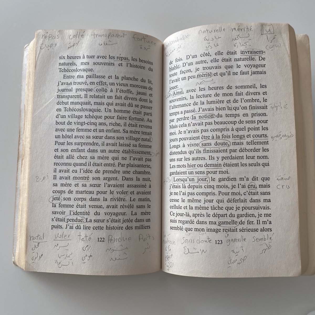 ٨/ المفيد في قراءة كامو هو بأن الجُمل التي يكتب بها قصيره بالإضافة إلى تكرار استخدامه للعديد من الكلمات، لذلك مع التقدّم في القراءة تجد بأنك تقوم بمراجعة الكلمات ولكن في سياقات وجمل جديدة وهذا أفضل من مراجعتها في قائمة خارج الكتاب