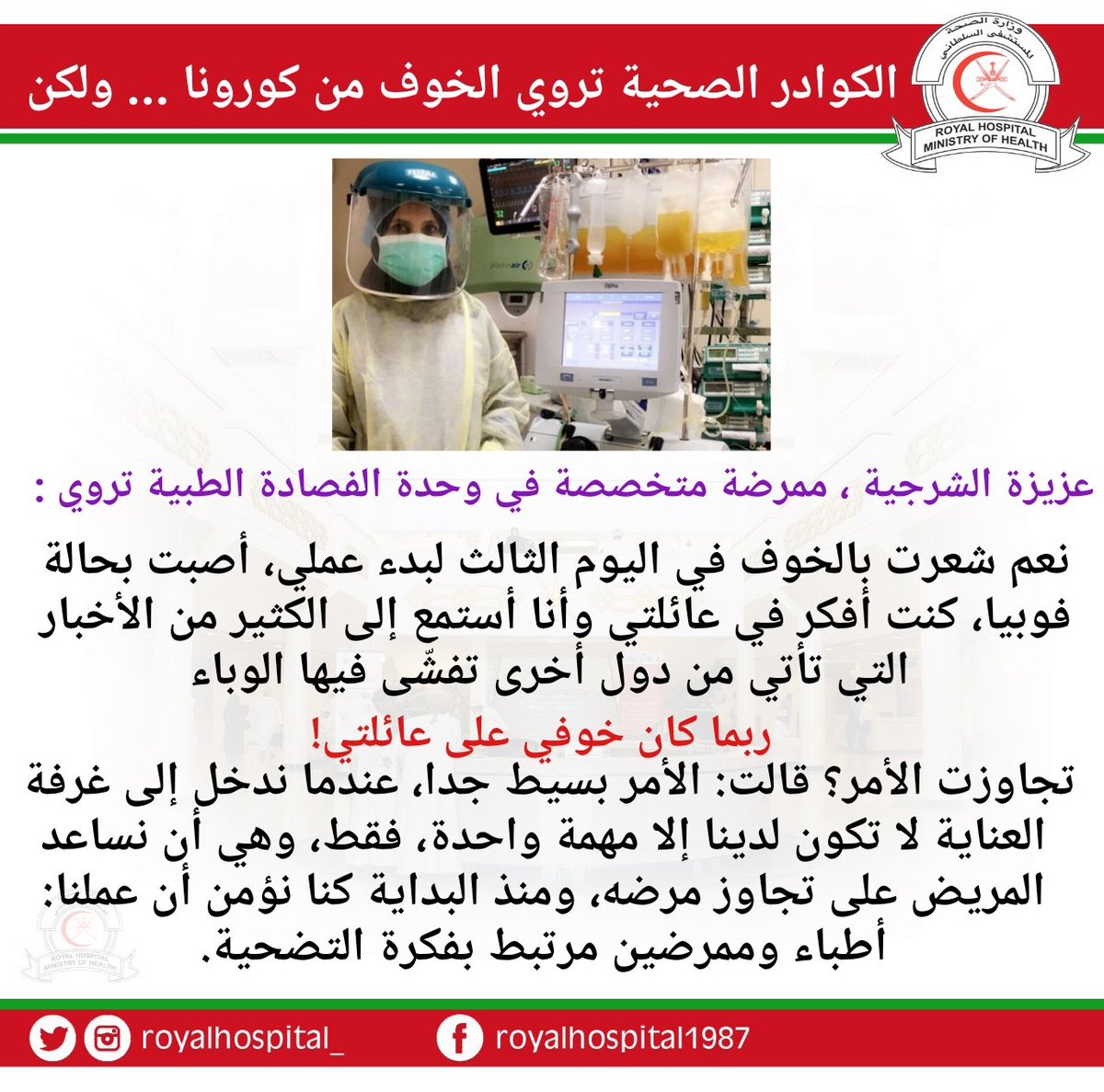 (سلسلة تغريدات ) لعدد من الكوادر الصحية تروي تجارب التعامل مع الخوف من كورونا أثناء العمل .