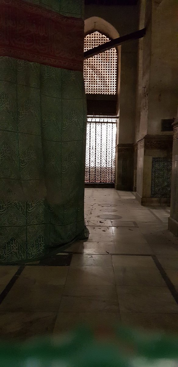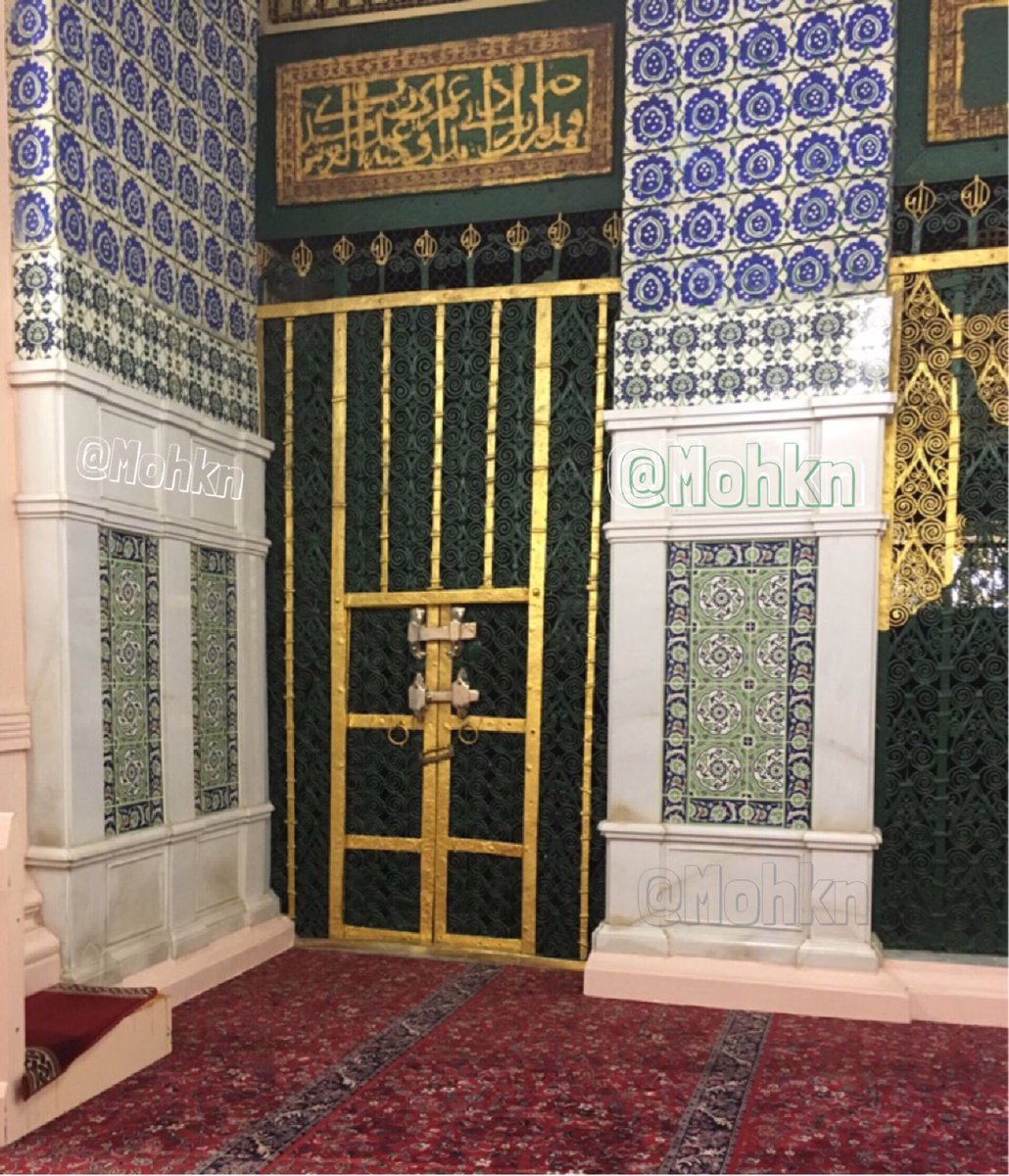 وعند دخول من باب فاطمة رضي الله عنها داخل للحجرة النبوية، تظهر الستارة الخضراء الموضوعة حول الجدار المصمت (ليس له باب) والذي بناه الخليفة الأموي عمر بن عبدالعزيز حول قبر النبي ﷺ والشبك الظاهر أمامكم بالتصوير هو من جهة الروضة الشريفة #المدينة_المنورة