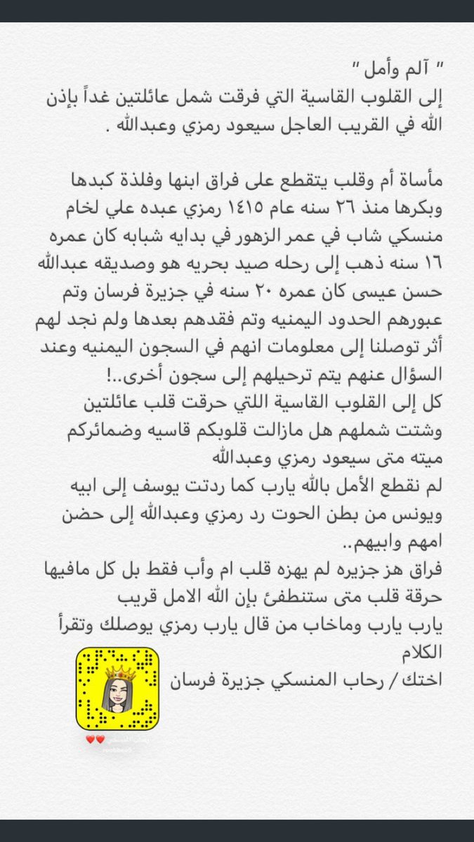 ان يرجع كل مفقود لفقيده، وكذلك اوصيكم بمتابعة حساب جمعية المفقودين @msngchildksa تحت قيادة الاستاذ @hkhamoud و المحامي الدكتور @Dr_BinShaya