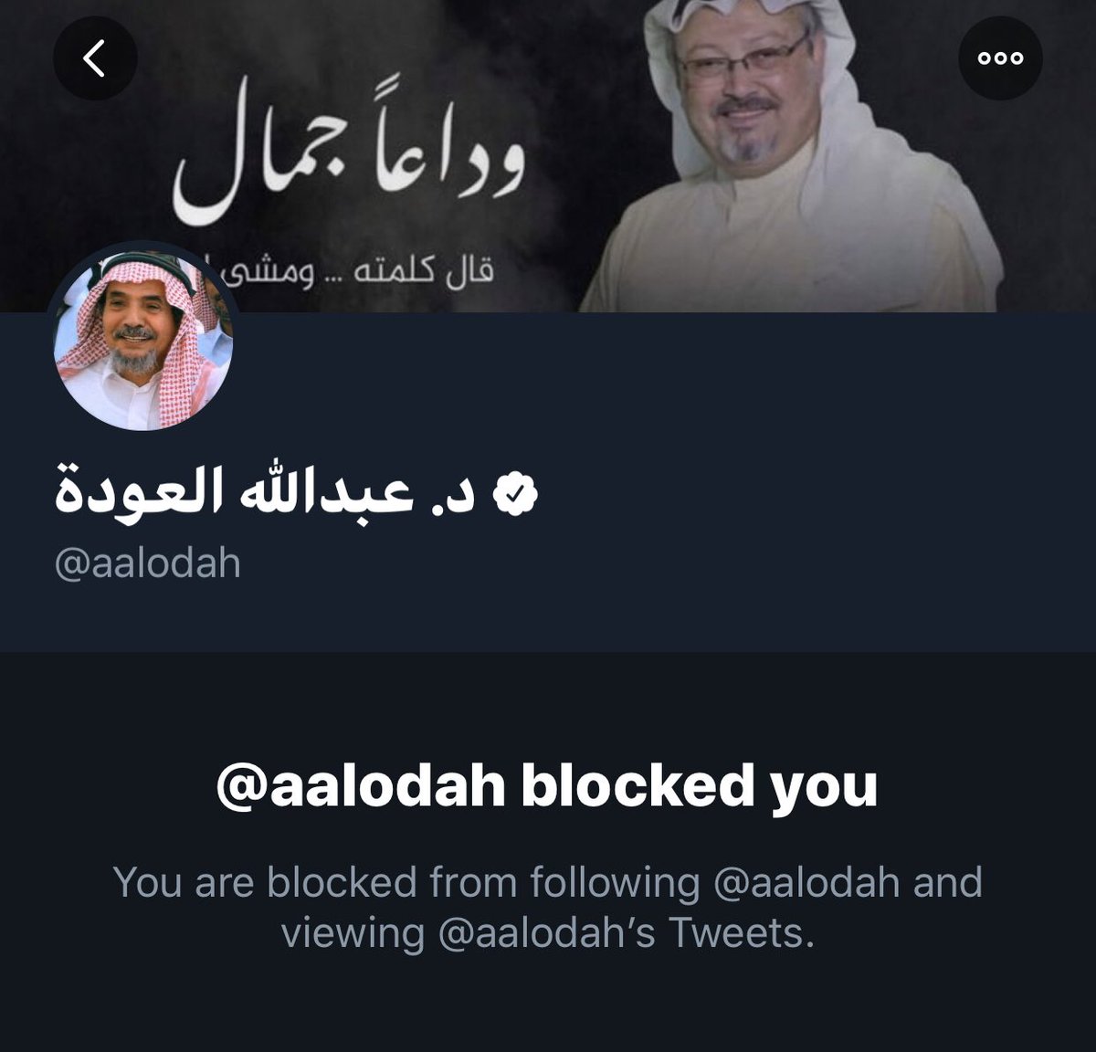 بقي أن نختم، أن نلاحظ ارتزاق مؤيديه؛ @aalodah عوضًا عن وضع صورة أبيه الموقوف بقضايا أمنية..يضع صورة الحامد في العرض و خاشقجي في الترويسة !