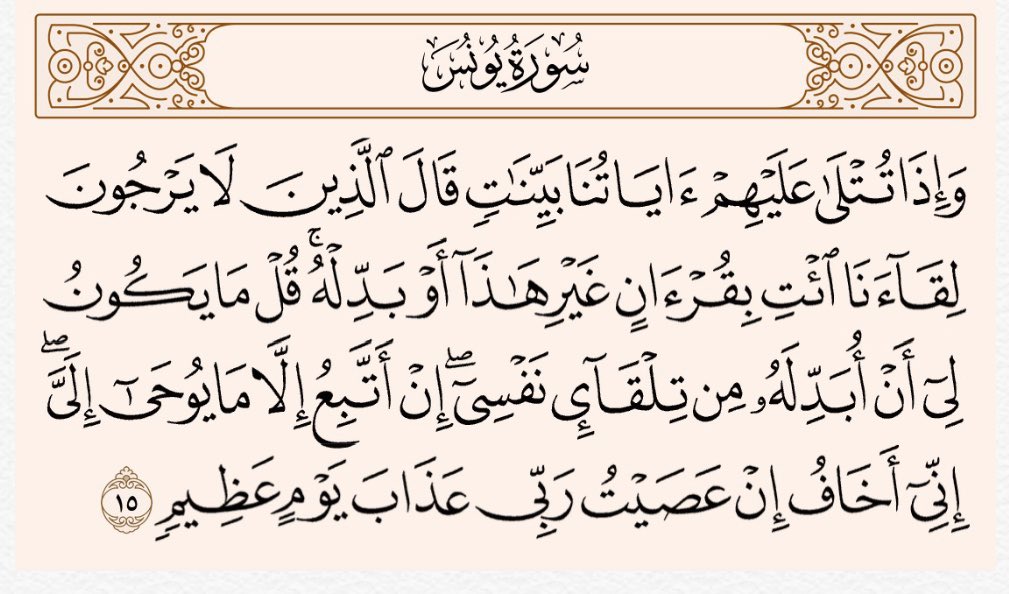 تذكر هذه الآية أن هناك من يطالبون النبي بأن يأتي بقرآن غير القرآن الذي أتاهم به، أو يبدله، إلا أن الله يأمره بأن يقول لهم، ليس لي أن آتيكم بشيء من عندي، ولا أتبع إلا ما يوحى إلي.