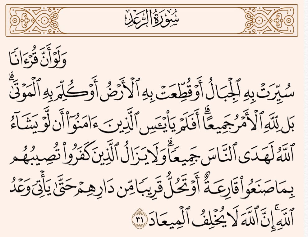 في هذه الآية يطلب المعارضون للنبي أن يكون القرآن معجِزاً ومخالفاً لسنن الكون، فيلتفت الله للمؤمنين مع شيء من العتاب بألا يشتغلوا بهؤلاء المعارضين، فأمر الهداية كله بيد الله، ومُذكِّراً الكافرين بالقوارع التي تحل بهم أو قريباً منهم.