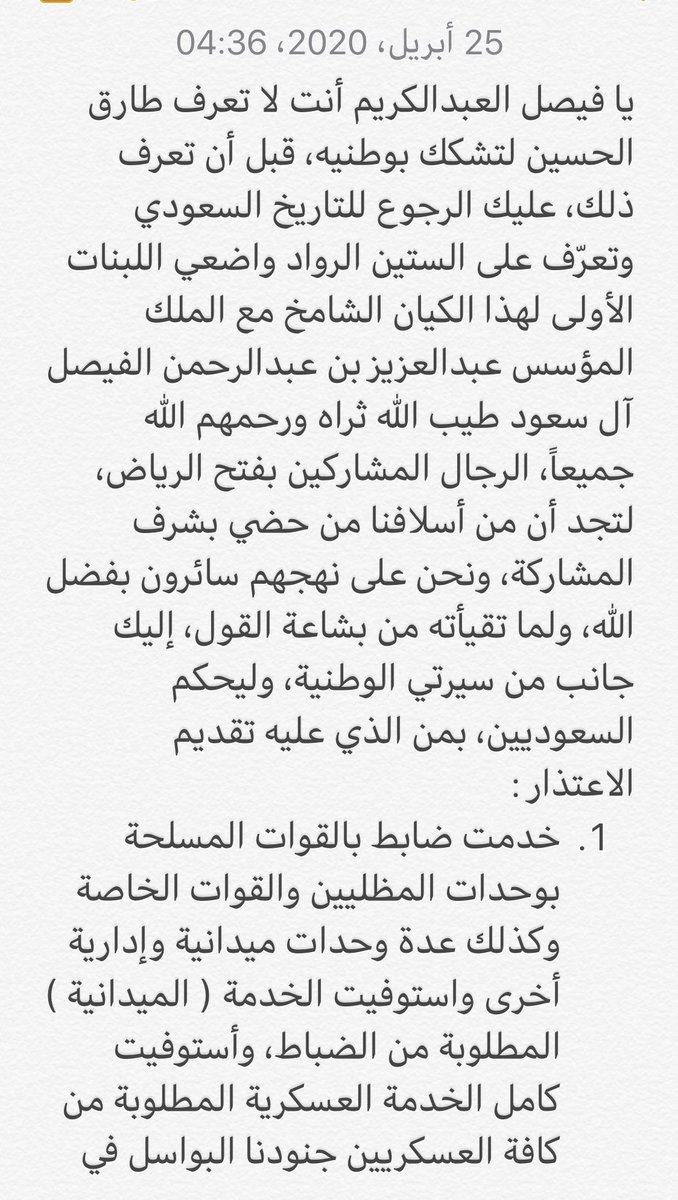@f_alabdulkarim @fahadm1212 @LaughWithMedia @MEWA_KSA @MotebBinFahad @HaifaAlMogrin @modgovksa @MOISaudiArabia @saudimomra @PmeMediacen @saudiwildlife @iyadabumoghli @Almethnbany @mub2day 3️⃣ لانك يا فيصل العبدالكريم لا تعرف طارق الحسين وماذا قدم لوطنه تقوم تنعته وتشكك بوطنيته وولاءه ⁉️