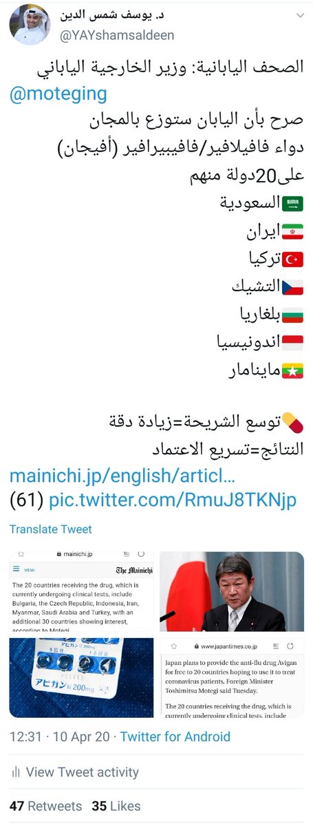 الصحف اليابانية نقلت على لسان وزير الخارجية الياباني @moteging بأن حكومة اليابان سترسل دواء أفيجان إلى قرابة43دولة