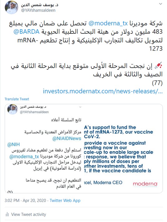 شركة موديرنا @moderna_tx سلّمت هيئة الغذاء والدواء طلب لاستئناف المرحلة الثانية من التجارب الإكلينيكية لتطعيمmRNA-1273 والتي متوقع بدايتها في الشهر القادم (يونيو) على600شخص لدراسة فاعلية التطعيم💉