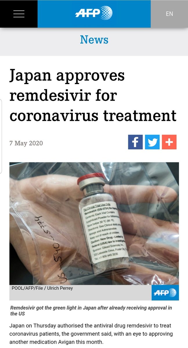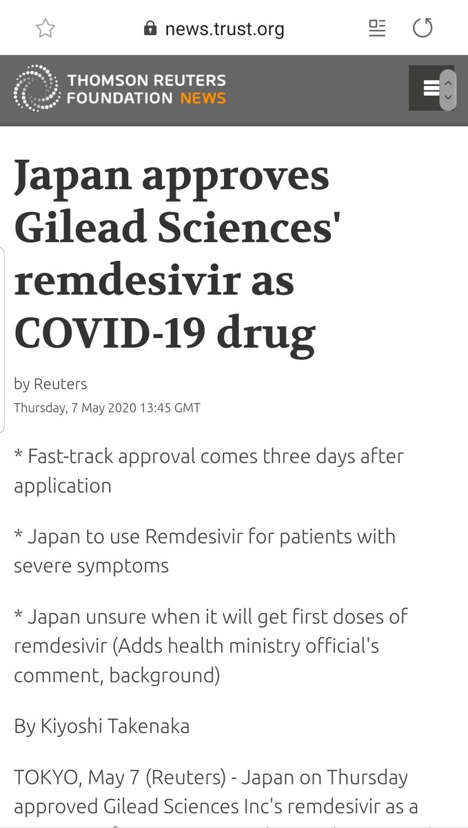 فإن اليابان أجازت اليوم دواء💉ريمديسيفير للاستخدام الطارئ للحالات الحرجة لمرضى كورونا كوفيد-١٩