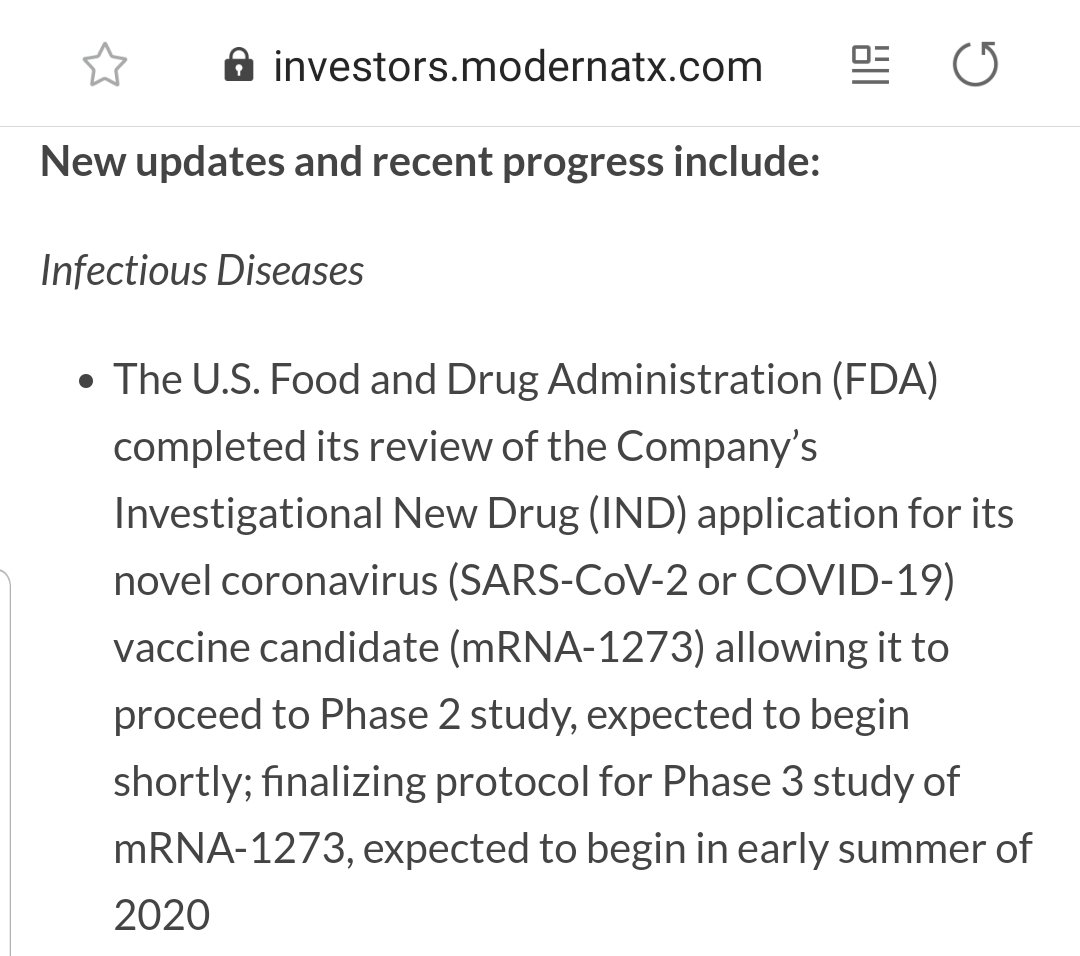 💉شركة موديرنا @moderna_tx تعلن عن حصولها على الموافقة من هيئة الغذاء و الدواء لبدء المرحلة الثانية لتطعيم mRNA-1273