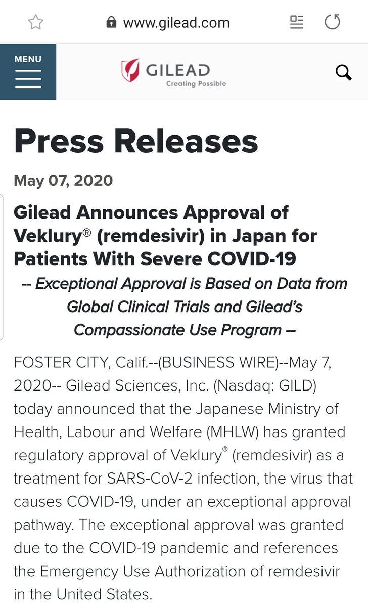 شركة جيلياد تعلن اعتماد💉ريمديسيفير -استثنائيًا- في اليابان🇯🇵كعلاج لكوفيد-١٩؛ بناء على: