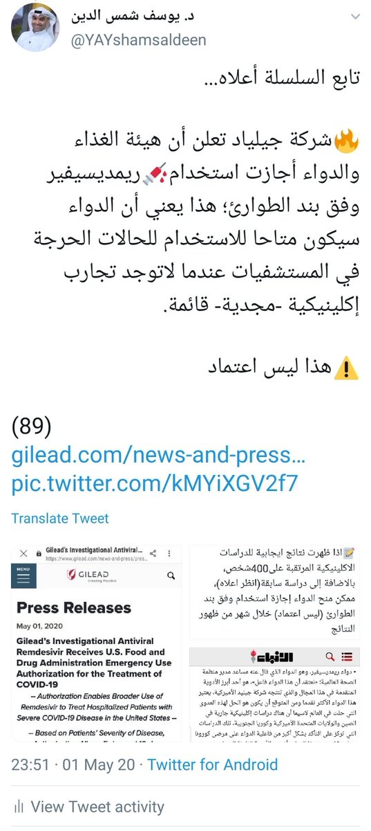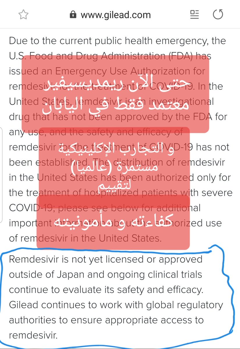 🔥شركة جيلياد تعلن أن هيئة الغذاء والدواء أجازت استخدام💉ريمديسيفير وفق بند الطوارئ؛ هذا يعني أن الدواء سيكون متاحا للاستخدام للحالات الحرجة في المستشفيات عندما لاتوجد تجارب إكلينيكية -مجدية- قائمة.